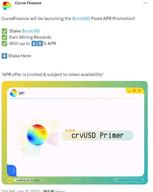 Kẻ xấu đã công bố một “khuyến mãi APR cố định” thay mặt cho giao thức blue-chip DeFi Curve Finance (CRV). Họ cung cấp tỷ lệ APR 60% cho mỗi khoản tiền gửi crvUSD được thực hiện thông qua bản sao giao diện Curve Finance (CRV) của họ. Một bản sao chính xác của giao diện Curve Finance (CRV) tối giản thực sự có sẵn thông qua liên kết được đính kèm bởi những kẻ lừa đảo. Tuy nhiên, chỉ có mô-đun swap có sẵn trên đó.