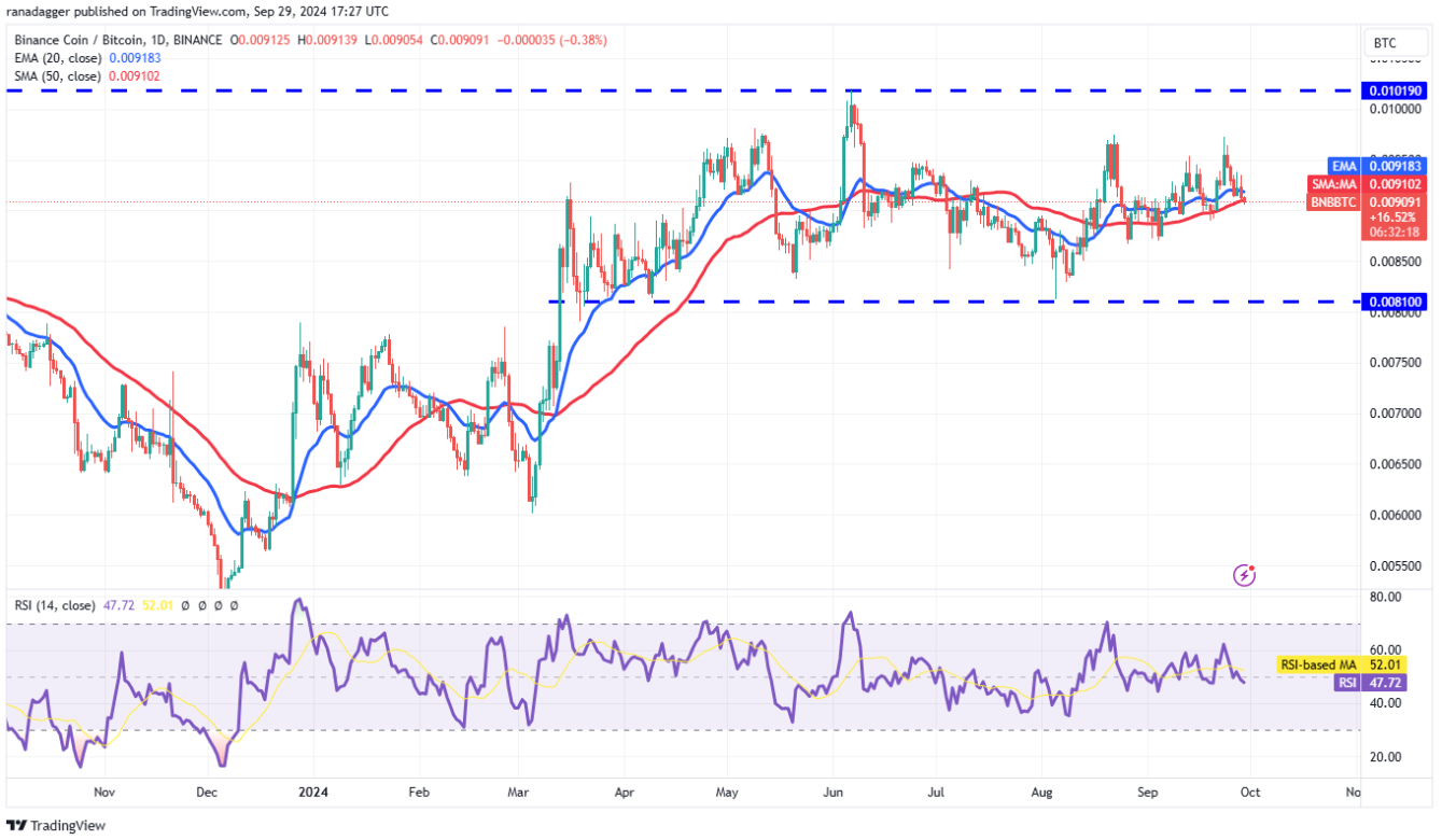 Nếu giá tiếp tục giảm và phá vỡ xuống dưới đường trung bình động đơn giản 20 tuần (SMA) ở mức 0,009 BTC, cặp BNB/BTC có thể giảm xuống đường trung bình động đơn giản 50 tuần (SMA) ở mức 0,008 BTC. Mức này có khả năng thu hút người mua, khiến cặp tiền này bị kẹt giữa SMA 50 tuần và mức 0,010 BTC trong một thời gian.