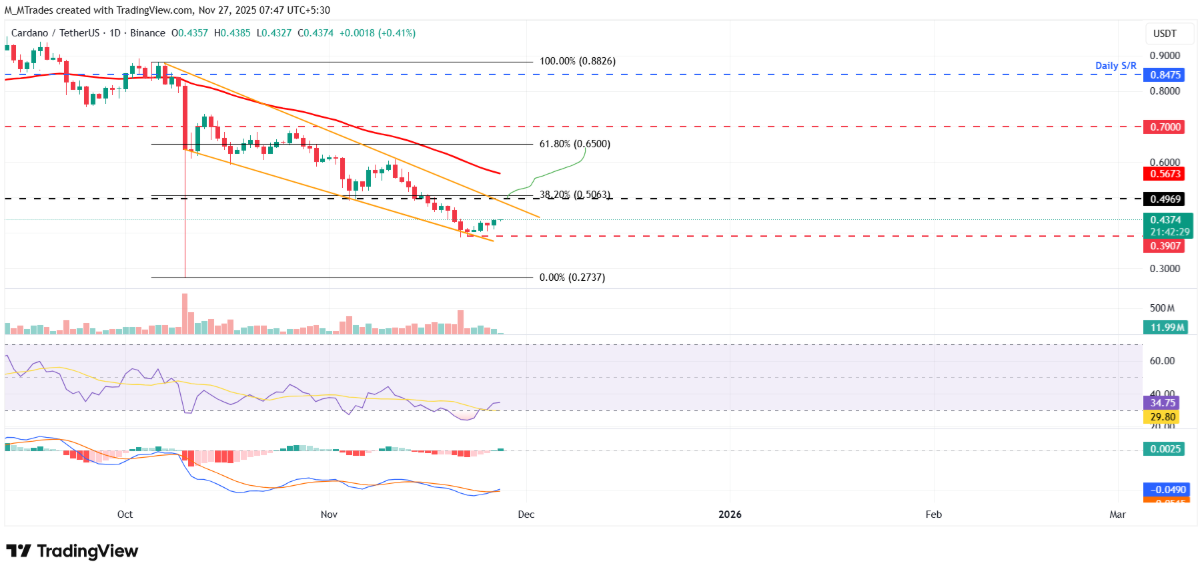 Vào thứ Bảy, giá Cardano (ADA) đã kiểm tra lại và tìm thấy hỗ trợ gần đường xu hướng dưới của mô hình cái nêm giảm – được hình thành từ việc nối các đỉnh và đáy bằng hai đường xu hướng – trước khi bật tăng 9% trong bốn ngày tiếp theo. Tại thời điểm viết bài vào thứ Năm, ADA dao động quanh mức 0,43 USD.