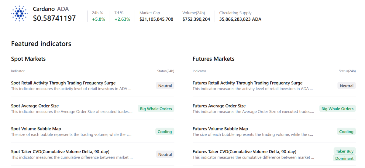 Dữ liệu từ CryptoQuant cũng mang tín hiệu tích cực. Cả thị trường giao ngay lẫn phái sinh của ADA đều chứng kiến các lệnh mua lớn từ cá voi, thị trường dần “hạ nhiệt” và ưu thế nghiêng về bên mua, mở ra khả năng hình thành một đợt phục hồi bền vững.