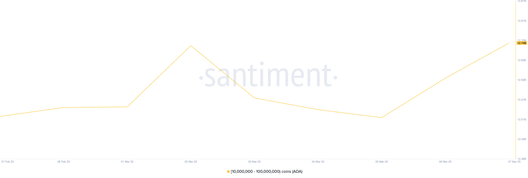 Theo dữ liệu từ Santiment, nhóm cá voi nắm giữ từ 10 triệu đến 100 triệu ADA đã gia tăng đáng kể lượng sở hữu trong tuần qua. Trong khoảng thời gian này, nhóm này đã thu mua thêm 220 triệu ADA, trị giá hơn 192 triệu USD theo giá thị trường hiện tại.