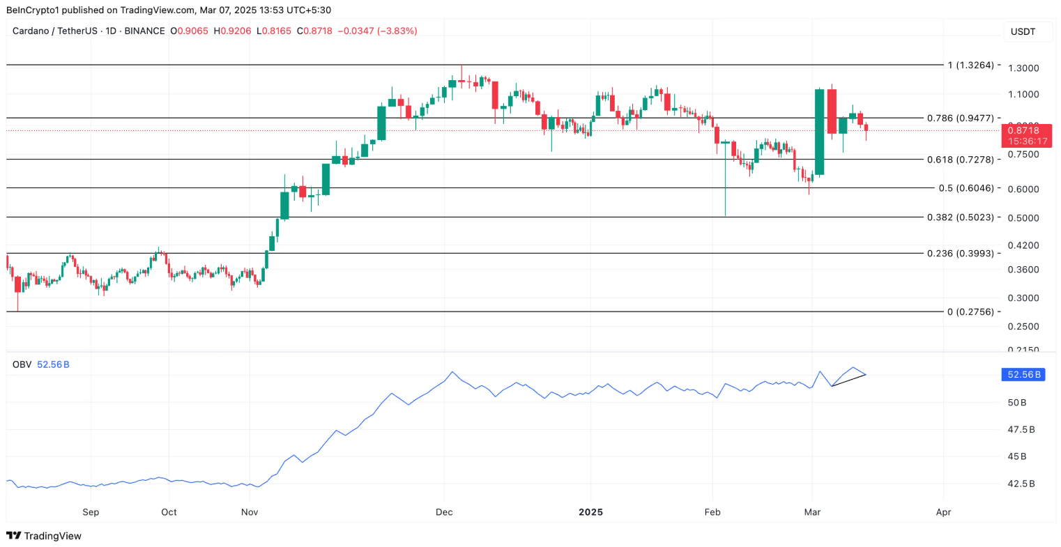 Trên biểu đồ ngày, chỉ báo On Balance Volume (OBV) của ADA tiếp tục tăng, xác nhận nhu cầu mạnh mẽ đối với đồng coin này. Hiện tại, OBV đạt mức 52,56 tỷ, tăng 2% kể từ ngày 1/3.
