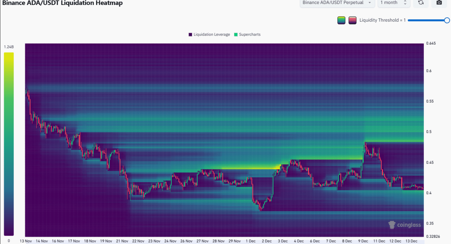Bản đồ nhiệt thanh lý trên khung thời gian một tháng cho thấy các lệnh thanh lý vị thế Short đang dày đặc phía trên đỉnh dao động gần nhất, quanh mốc 0,48 USD. Vùng giá mang tính “từ tính” này có khả năng hút giá đi lên, tái hiện kịch bản từng xuất hiện vào đầu tháng.