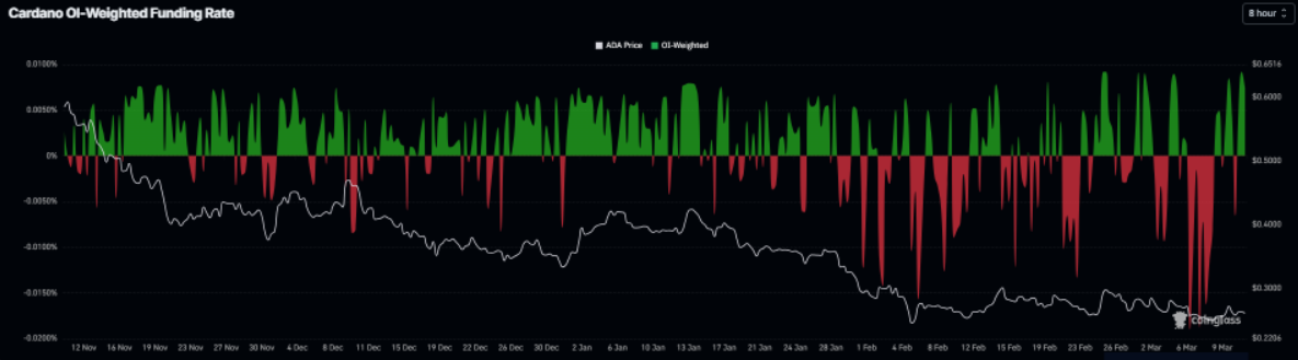 Trái ngược với tín hiệu từ OI, chỉ báo funding rate lại đang nghiêng về kịch bản lạc quan hơn. Theo dữ liệu OI-Weighted Funding Rate từ CoinGlass, số lượng trader đặt cược vào xu hướng giảm của ADA hiện ít hơn so với những người kỳ vọng giá sẽ đi lên. Chỉ số này đã chuyển sang vùng dương từ thứ Tư và hiện ở mức 0,0075% vào thứ Năm, cho thấy phe Long đang chấp nhận trả phí cho phe Short để duy trì vị thế.