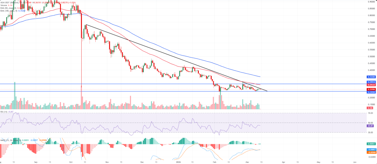 Cardano (ADA) đang tiến sát đường xu hướng giảm và được giao dịch quanh mốc 0,26 USD tại thời điểm ghi nhận vào thứ Năm. Nếu vượt qua vùng kháng cự quan trọng này, đồng coin có thể kích hoạt một nhịp tăng giá mới trong ngắn hạn.