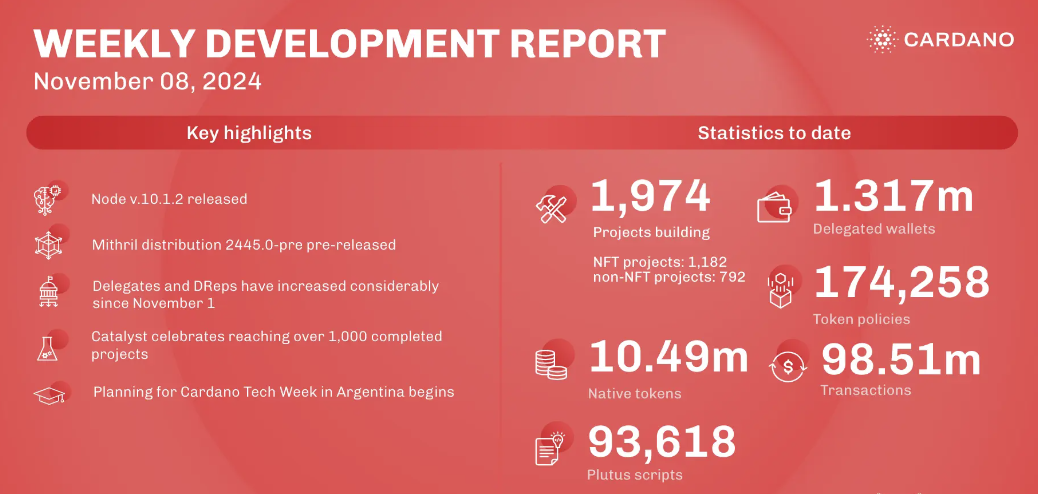 Phiên bản Cardano node v.10.1.2 đã được cập nhật với nhiều cải tiến, đặc biệt là các lệnh mới được triển khai dựa trên phản hồi từ cộng đồng, đặc biệt là từ các nhà điều hành stake pool. Kể từ ngày 1 tháng 11 năm 2024, số lượng đại biểu duy nhất đã tăng từ 13.835 lên 16.902, trong khi số đoàn đại biểu bỏ phiếu cũng gia tăng từ 15.060 lên 18.366. Đặc biệt, số lượng đăng ký DRep đã tăng thêm 21, từ 603 lên 624.