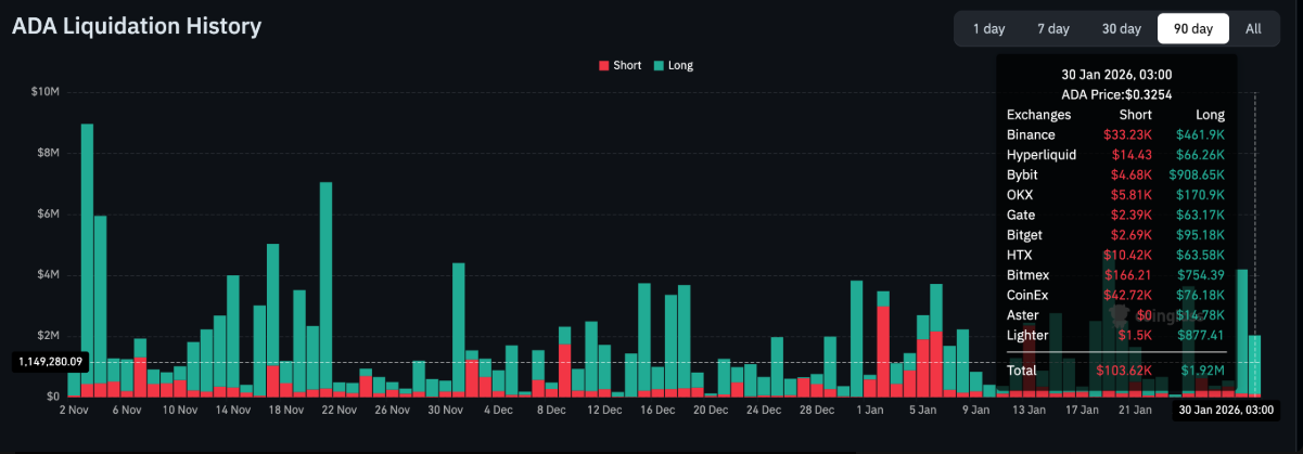 Cardano đã mất khoảng 11% giá trị so với mức mở cửa đầu tuần tại 0,36 USD, đồng thời giảm thêm 2% so với mức mở cửa trong ngày ở 0,33 USD, qua đó củng cố bức tranh u ám bao trùm thị trường. Áp lực bán gia tăng buộc các trader sử dụng đòn bẩy phải chấp nhận cắt lỗ, khi tổng giá trị các vị thế mua (long) bị thanh lý trong ngày thứ Sáu lên tới gần 2 triệu USD, dù đã hạ nhiệt so với mức xấp xỉ 4 triệu USD ghi nhận trong ngày thứ Năm. Làn sóng thanh lý các vị thế long tiếp tục khuếch đại đà giảm giá của ADA.