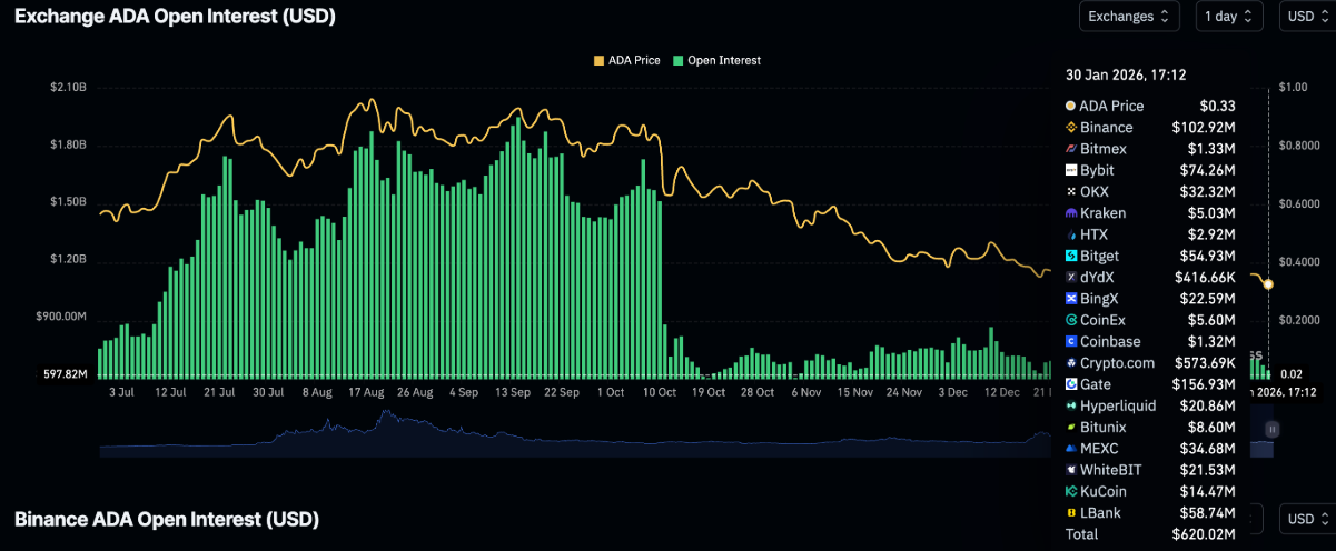 Ở chiều ngược lại, sự tham gia của nhà đầu tư nhỏ lẻ vẫn khá trầm lắng khi những bất ổn của thị trường khiến nhiều người lựa chọn đứng ngoài quan sát. Dữ liệu từ thị trường phái sinh càng cho thấy tín hiệu suy yếu rõ rệt, với hợp đồng mở (OI) giảm xuống còn 621 triệu USD trong ngày thứ Bảy, từ mức 647 triệu USD của phiên trước. Là thước đo giá trị danh nghĩa của các hợp đồng tương lai đang lưu hành, việc OI sụt giảm liên tiếp phản ánh niềm tin của thị trường vào triển vọng phục hồi của Cardano đang dần phai nhạt.