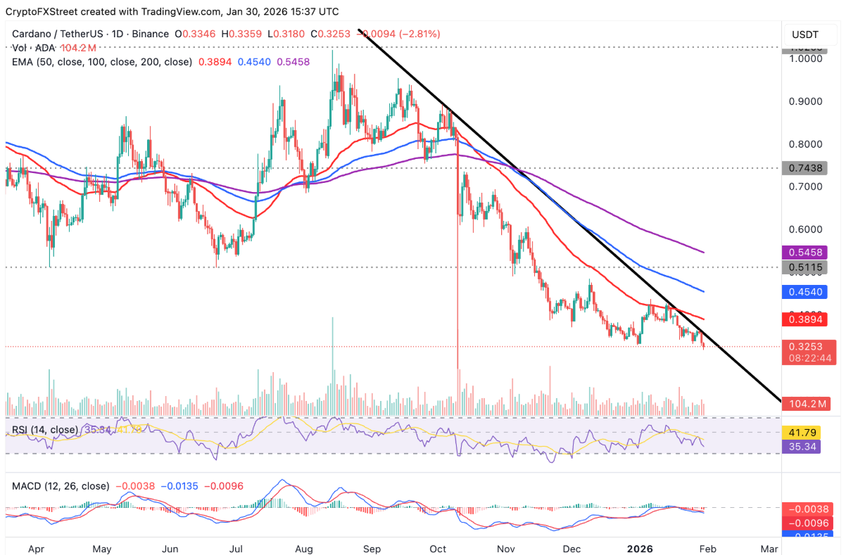 Cardano đang dần lùi về vùng hỗ trợ then chốt 0,30 USD, trong bối cảnh giá vẫn bị kìm hãm bên dưới loạt đường trung bình động hàm mũ quan trọng, gồm EMA 50 ngày tại 0,33 USD, EMA 100 ngày ở 0,45 USD và EMA 200 ngày quanh 0,55 USD. Độ dốc đi xuống của các đường EMA tiếp tục củng cố bức tranh xu hướng giảm đang chi phối thị trường.