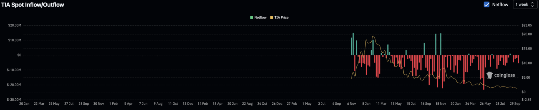 Mặc dù đợt mở khóa sắp tới thường được coi là tín hiệu tiêu cực, các nhà đầu tư Spot dường như vẫn giữ vững sự tự tin với altcoin này. Trong tuần vừa qua, họ đã tích lũy khoảng 5,49 triệu USD giá trị TIA – mức mua theo tuần cao nhất tính đến tuần kết thúc vào ngày 13 tháng 8.