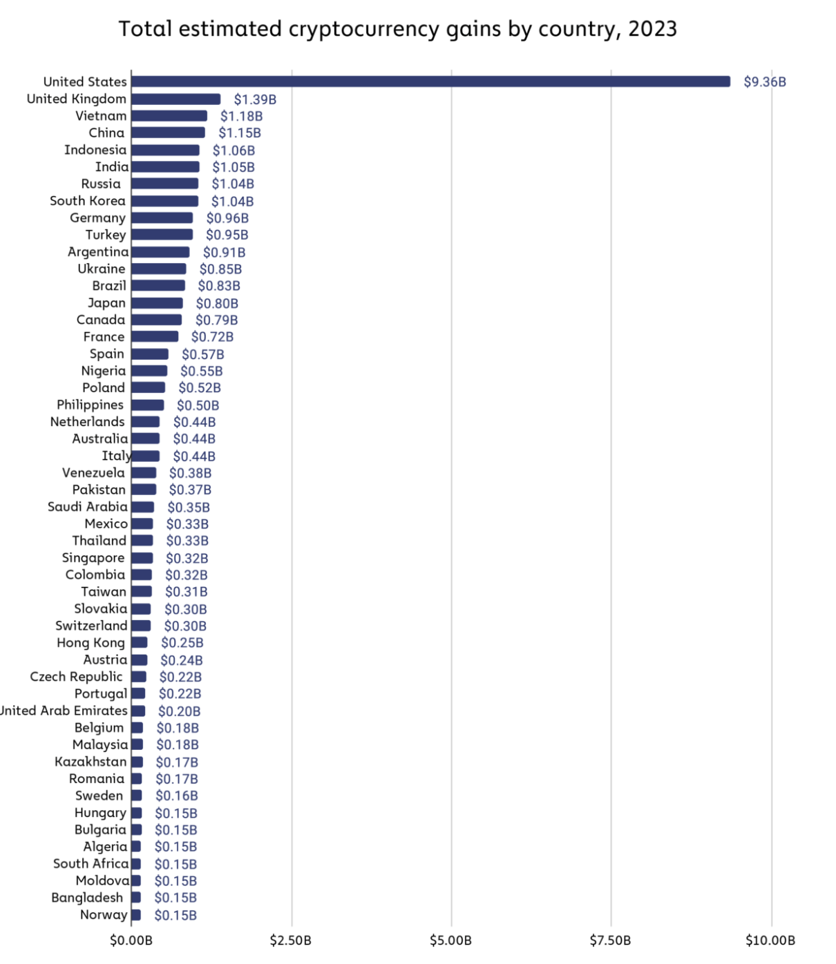Theo một báo cáo mới từ Chainalysis, tổng lợi nhuận toàn cầu của không gian tiền điện tử trong năm 2023 đạt 37,6 tỷ USD, trong đó Hoa Kỳ dẫn đầu với khoảng 9,3 tỷ USD, theo sau là Vương quốc Anh với gần 1,4 tỷ USD.