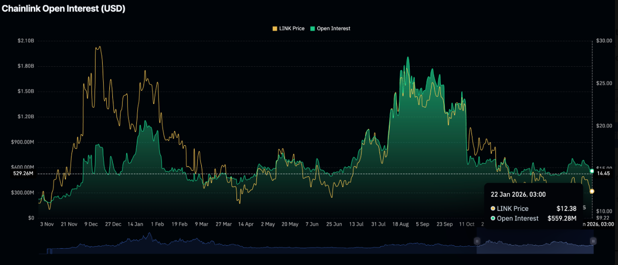 Không chỉ mảng staking, thị trường phái sinh của Chainlink cũng chịu áp lực rõ rệt. Hợp đồng mở (OI) trên thị trường hợp đồng tương lai đã lùi về 559 triệu USD vào thứ Sáu, giảm so với 566 triệu USD của ngày trước đó và thấp hơn nhiều so với mốc 708 triệu USD vào ngày 6/1.
