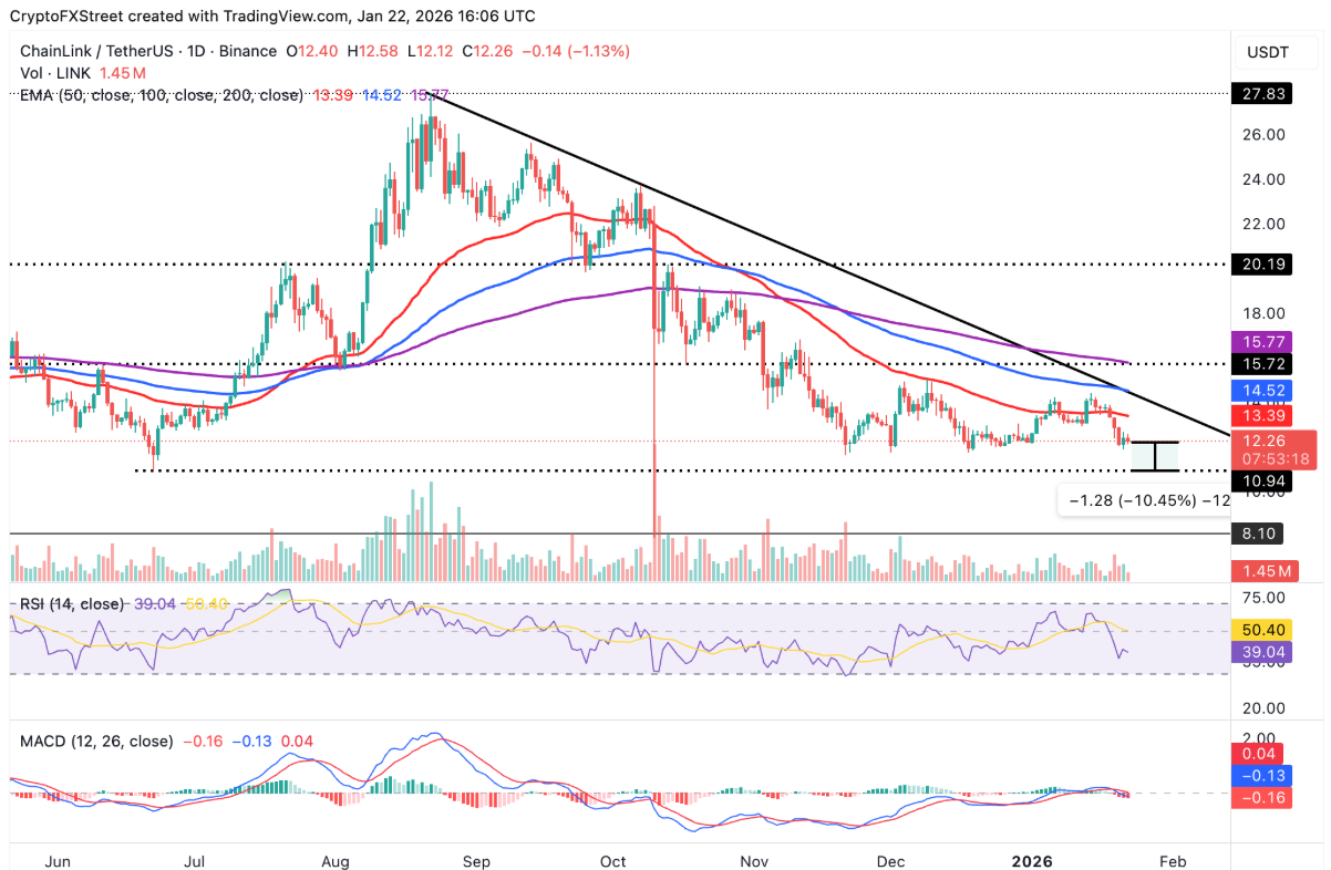 Áp lực giảm giá đối với Chainlink chủ yếu xuất phát từ sự suy yếu của dòng tiền nhà đầu tư nhỏ lẻ cùng tâm lý thị trường kém tích cực. Điều này được phản ánh rõ qua sự sụt giảm của lượng token staking và chỉ số OI. Về mặt kỹ thuật, LINK đang di chuyển trong cấu trúc ngày càng bất lợi, khi giá nằm dưới các đường trung bình động hàm mũ quan trọng: EMA 50 ngày tại 13,39 USD, EMA 100 ngày tại 14,51 USD và EMA 200 ngày tại 15,77 USD.