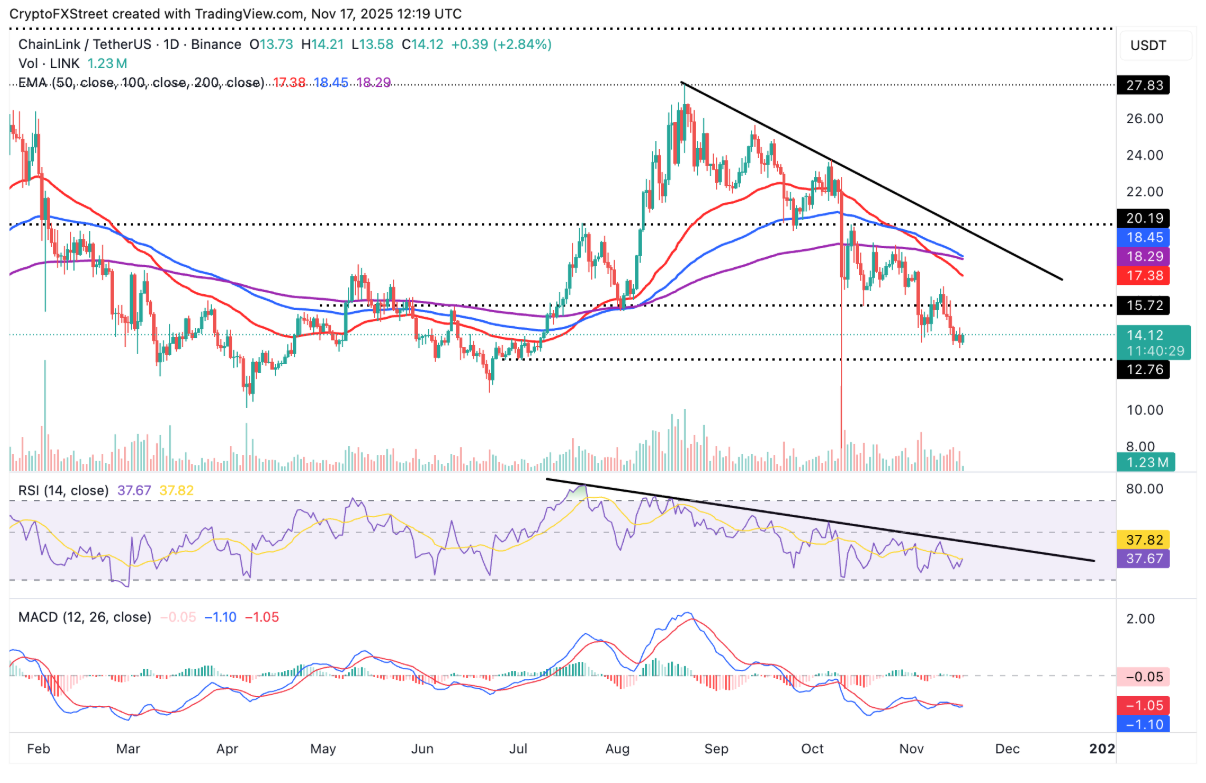 Chainlink đang giao dịch quanh mốc 14 USD, nhưng các tín hiệu kỹ thuật vẫn cho thấy dấu hiệu suy yếu. Chỉ số sức mạnh tương đối (RSI) hiện ở mức 34, gần với vùng quá bán, cho thấy phe gấu vẫn đang chiếm ưu thế trên thị trường.