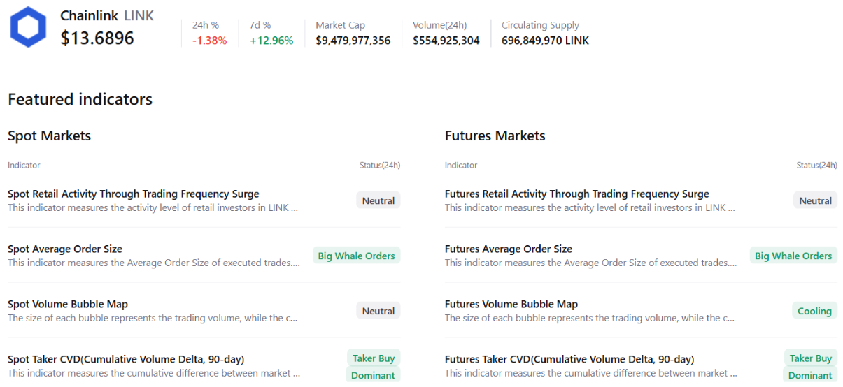 Bên cạnh đó, dữ liệu tổng hợp từ CryptoQuant cũng củng cố triển vọng tích cực, khi thị trường giao ngay và hợp đồng tương lai của Chainlink ghi nhận các lệnh mua lớn từ cá voi, điều kiện thị trường “hạ nhiệt” và ưu thế nghiêng về phe bò. Những yếu tố này phát đi tín hiệu về khả năng xảy ra một đợt tăng giá trong những ngày tới.
