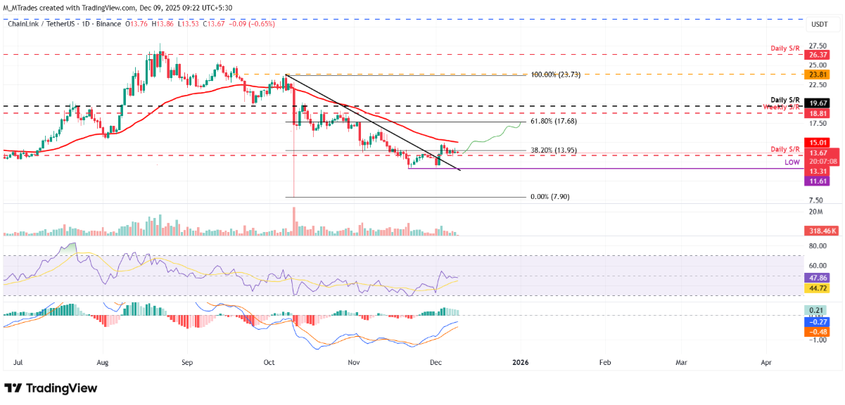 Giá Chainlink (LINK) đã bứt phá đường xu hướng giảm kéo dài từ đầu tháng 10 trong phiên ngày 2/12 và bật tăng gần 9% chỉ một ngày sau đó. Dù vậy, đà tăng nhanh chóng chững lại, đưa LINK quay về kiểm tra vùng hỗ trợ 13,31 USD trên khung ngày. Tính đến thời điểm viết bài vào thứ Ba, LINK vẫn giao dịch ổn định phía trên vùng này, quanh mức 13,67 USD.