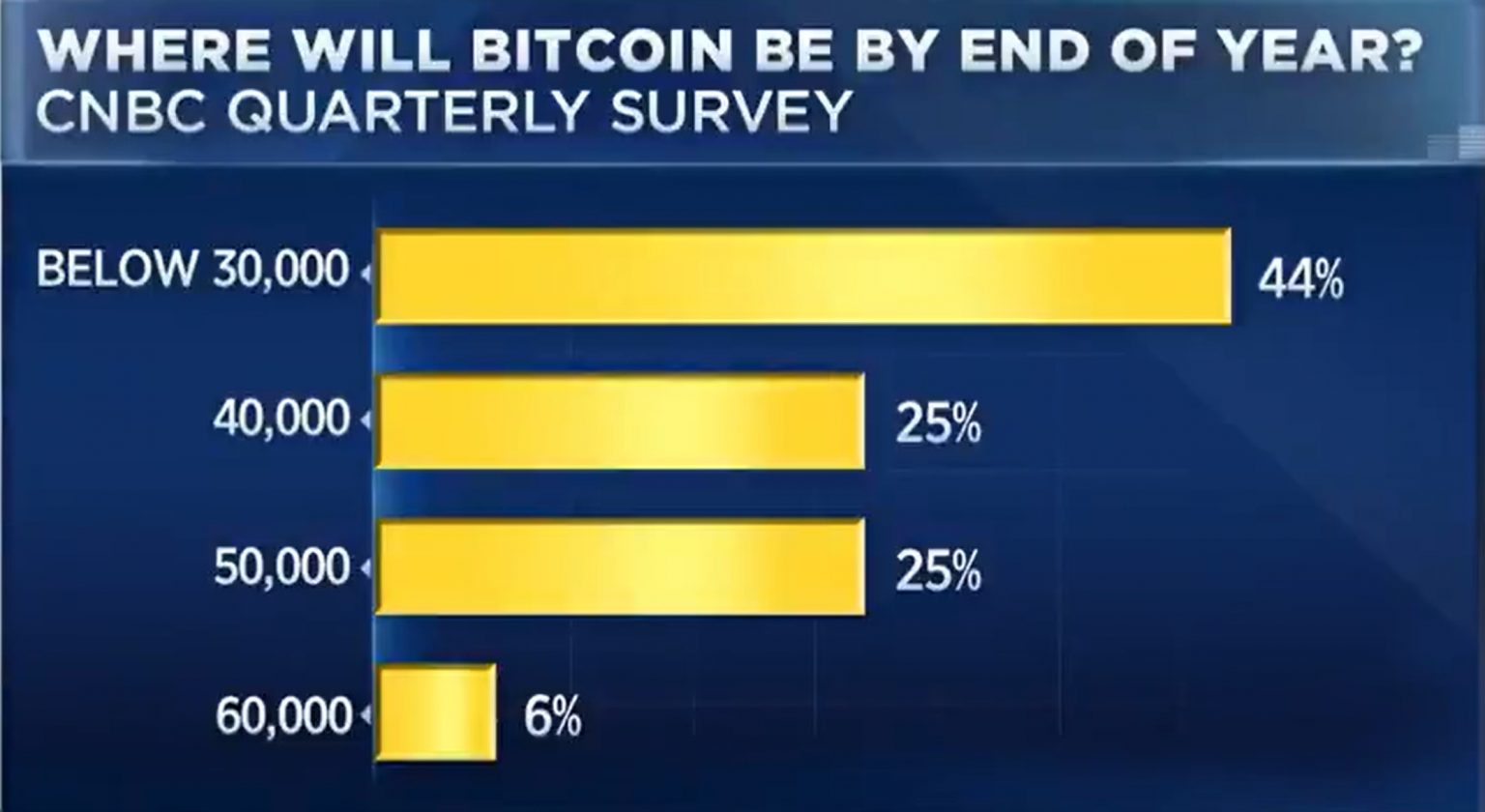 Các chuyên gia đã tiết lộ những gì họ nghĩ rằng giá bitcoin sẽ như thế nào vào cuối năm 2021 trong một cuộc khảo sát của CNBC. Hàng quý, nhà đài thăm dò ý kiến của khoảng 100 giám đốc đầu tư, chiến lược gia cổ phiếu và nhà quản lý danh mục đầu tư về quan điểm của họ đối với thị trường trong phần còn lại của năm. Cuộc khảo sát mới nhất được thực hiện từ ngày 23 đến 30 tháng 6.