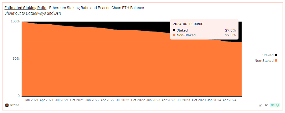 Staking trên Ethereum đang tăng trưởng mạnh mẽ, với khoản tiền gửi 32 ETH vào hợp đồng thông minh chính. Dựa trên số lượng token gửi và rút, khoảng 27,5% tổng nguồn cung ETH đã được staked, chỉ còn lại 72,5%. Trong số này, một phần cũng có thể có tính thanh khoản kém, được giữ trong ví dài hạn, trong các kho tiền (vaults) hoặc giao thức khác.