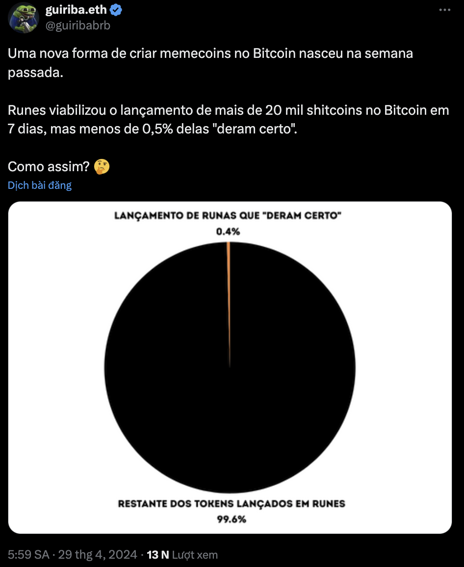Guiriba, nhà phân tích tại công ty nghiên cứu Paradigma Education của Brazil, đã chia sẻ rằng chỉ có 77 memecoin trong hơn 20.000 token được tung ra trên Runes có hơn 500 hodler.