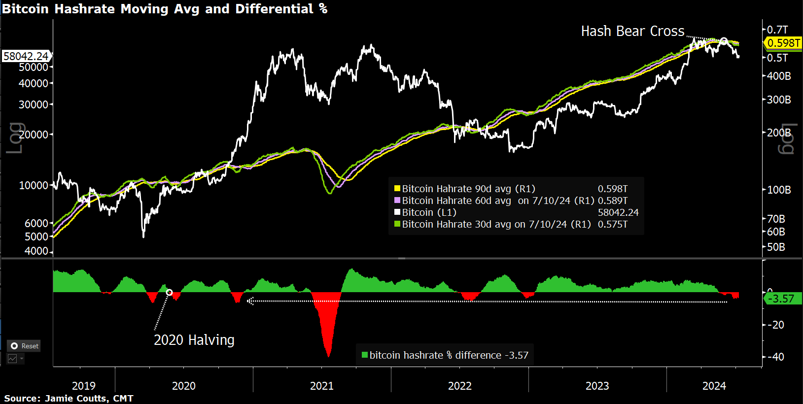 Coutts cho biết tốc độ giảm hashrate của Bitcoin đang chậm lại, lưu ý rằng điều này thường xảy ra trước khi đảo ngược đáy của đường chéo giảm giá, xảy ra sau sự kiện halving. Tuy nhiên, ông cảnh báo rằng sự đảo ngược tăng giá vẫn phụ thuộc vào “sự ổn định trong xu hướng giảm”.