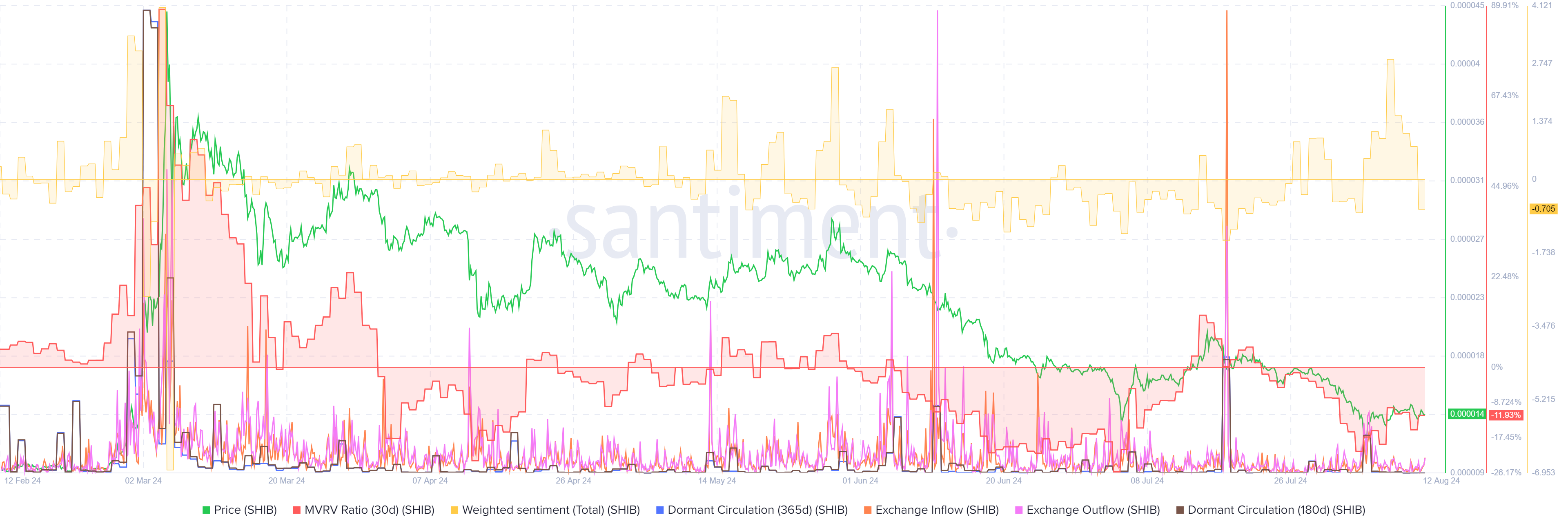 Tâm lý trọng số của SHIB đã giảm xuống -0,7, và tỷ lệ Giá trị Thị trường so với Giá trị Hiện tại (MVRV) trong 30 ngày là -11,9%, cho thấy tất cả các nhà đầu tư SHIB trong 30 ngày qua đang chịu mức lỗ trung bình 11%.