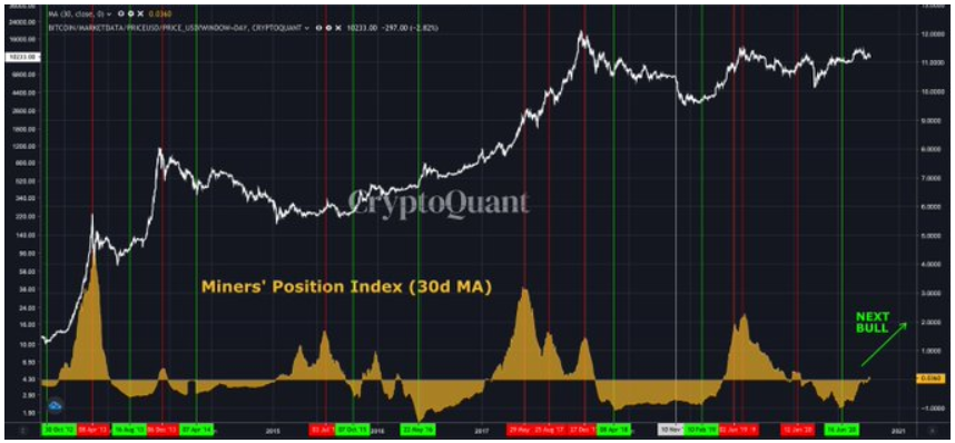 “Nếu các thợ đào BTC vẫn thúc đẩy giá, đợt tăng giá tiếp theo sẽ sớm bắt đầu. MPI (Miner Position Index) có tỷ lệ dự đoán đúng rất cao trong việc dự báo thị trường tăng/giảm khi các yếu tố vĩ mô như thị trường chứng khoán là không đáng kể ”.