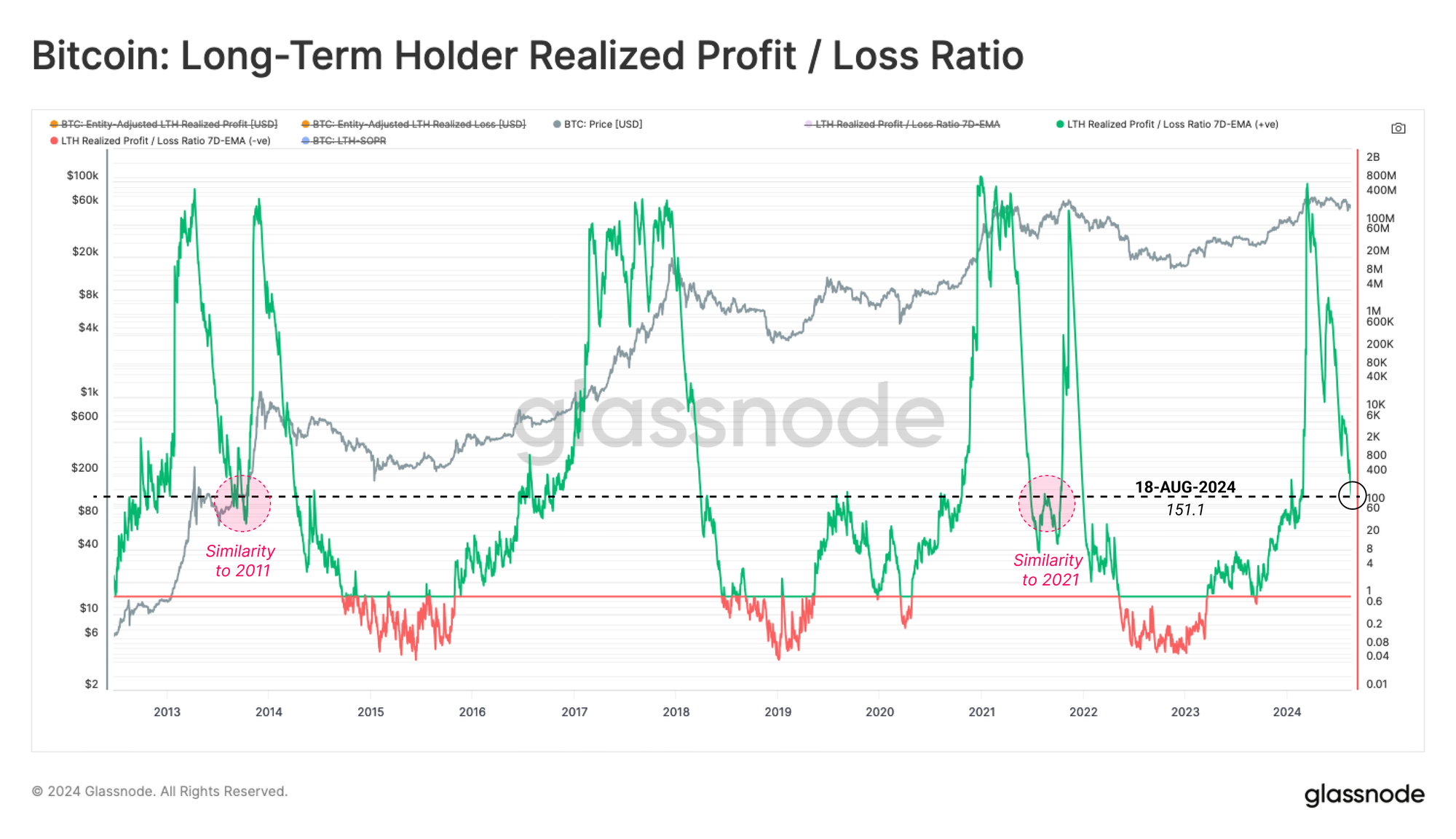 Chỉ số Realized Profit/Loss Ratio của LTHs, mặc dù có sự suy giảm từ mức đỉnh cao đạt được vào tháng 3 năm 2024, vẫn ở mức cao. Điều này cho thấy các nhà đầu tư dài hạn vẫn tiếp tục chốt lời, nhưng với tốc độ chậm lại, tương tự như các chu kỳ thị trường trước đó, chẳng hạn như đỉnh cao vào năm 2013 và 2021.