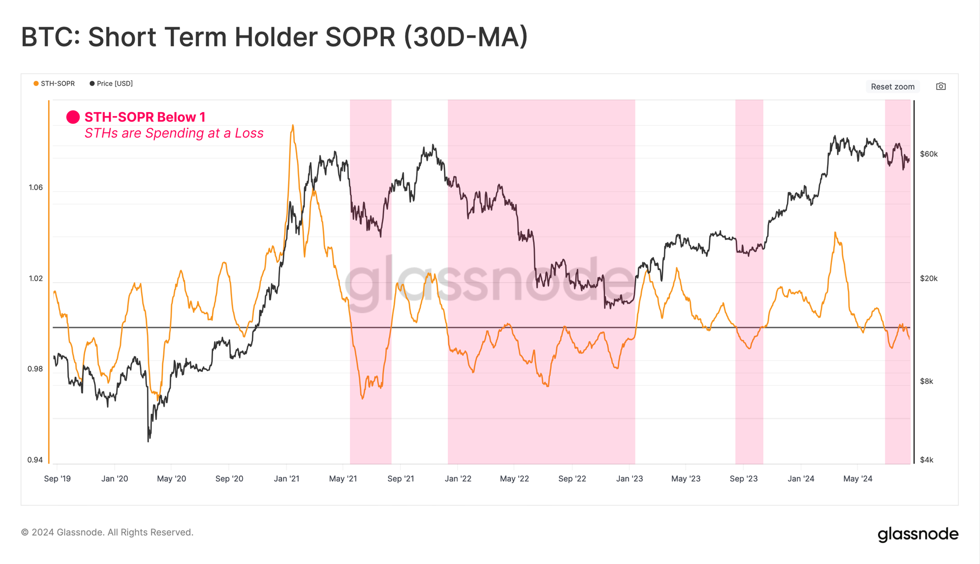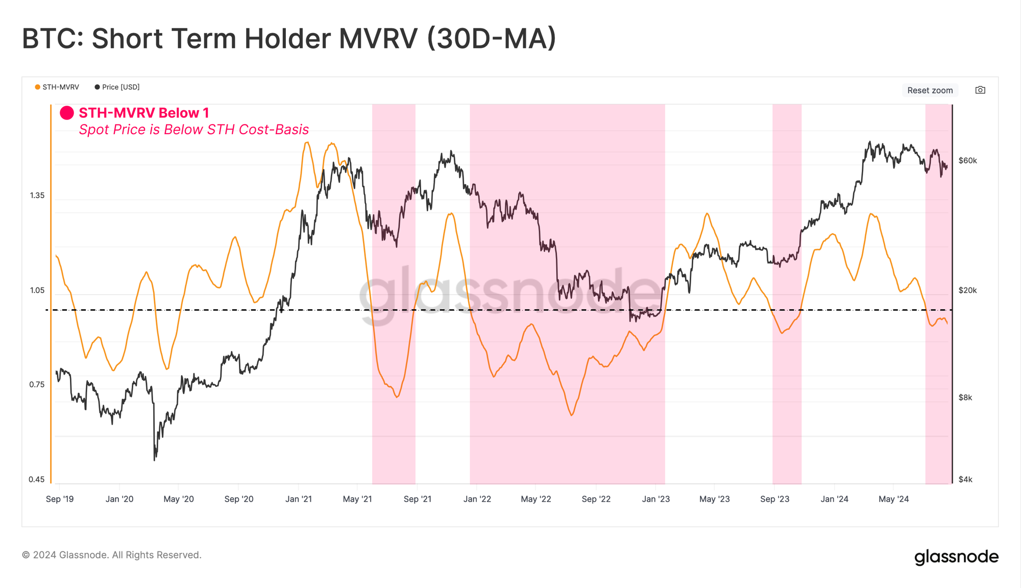 Ngược lại với sự kiên định của các nhà đầu tư dài hạn, các nhà đầu tư ngắn hạn (Short-Term Holders – STHs) đang đối mặt với những thách thức lớn. Chỉ số STH-MVRV Ratio, một thước đo quan trọng để đánh giá lỗ lãi chưa thực hiện của nhà đầu tư ngắn hạn, đã giảm xuống dưới mức 1.0, cho thấy phần lớn nhà đầu tư mới đang phải chịu lỗ. Thực tế, chỉ số này ám chỉ rằng những người mua Bitcoin trong thời gian gần đây đang nắm giữ các vị thế lỗ chưa thực hiện, điều này có thể gây ra tâm lý hoảng loạn và bán tháo, đặc biệt trong những giai đoạn thị trường suy yếu.