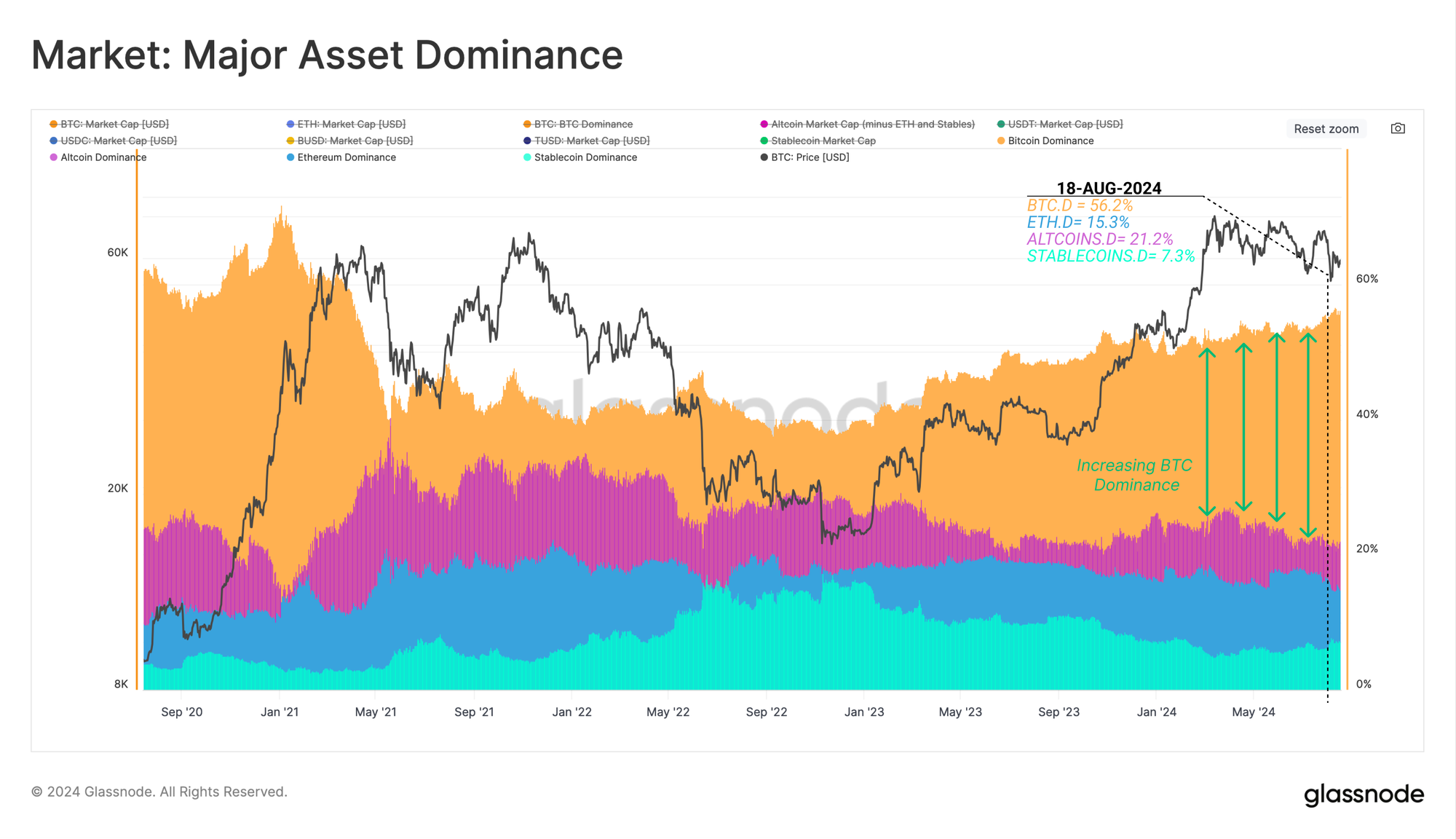 Kể từ khi chạm đáy vào tháng 11 năm 2022, Bitcoin đã khẳng định vị thế thống trị của mình khi tỷ lệ vốn hóa của nó trong tổng thị trường tiền điện tử tăng vọt từ 38.7% lên 56.2% vào tháng 8 năm 2024. Điều này không chỉ thể hiện sự tin tưởng của nhà đầu tư vào tài sản kỹ thuật số này, mà còn phản ánh xu hướng dòng vốn dịch chuyển khỏi các tài sản rủi ro hơn trong bối cảnh thị trường bất ổn.