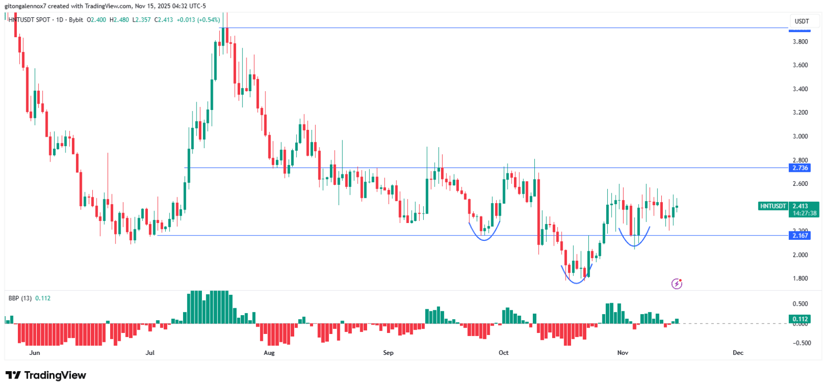 HNT vừa trải qua một nhịp điều chỉnh ngắn hạn nhưng vẫn vững vàng trên vùng hỗ trợ 2 USD. Thay vì xuyên thủng vùng này, giá duy trì trong cấu trúc mô hình vai đầu vai, đồng thời phát triển một nền giá tiềm năng.