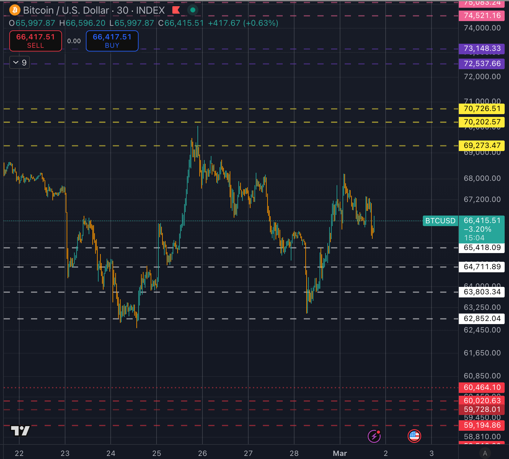 Về mặt kỹ thuật, hành động giá cuối tuần tuân theo mô hình quen thuộc: biến động mạnh trong điều kiện thanh khoản thấp, sau đó hồi phục nhanh khi tâm lý hoảng loạn suy yếu. Ngày 28/2, BTC dao động trong vùng 63.068–67.657 USD và đóng cửa ở 66.995 USD. Ngày 1/3, giá từng tăng lên 68.159 USD trước khi lùi về quanh 66.000 USD.