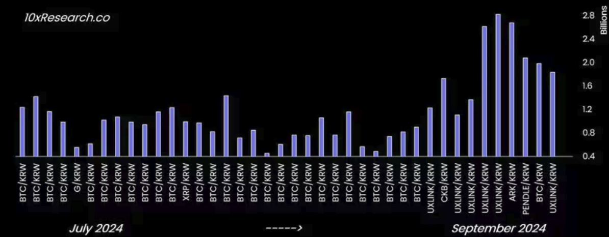 Biểu đồ bên dưới từ 10x Research cho thấy khối lượng giao dịch hàng ngày của Hàn Quốc trong 40 ngày qua, với các cặp giao dịch phổ biến. Gần đây, các trader đã dịch chuyển từ cặp BTC/KRW sang các altcoin như UXLINK, CKB, ARK và PENDLE.