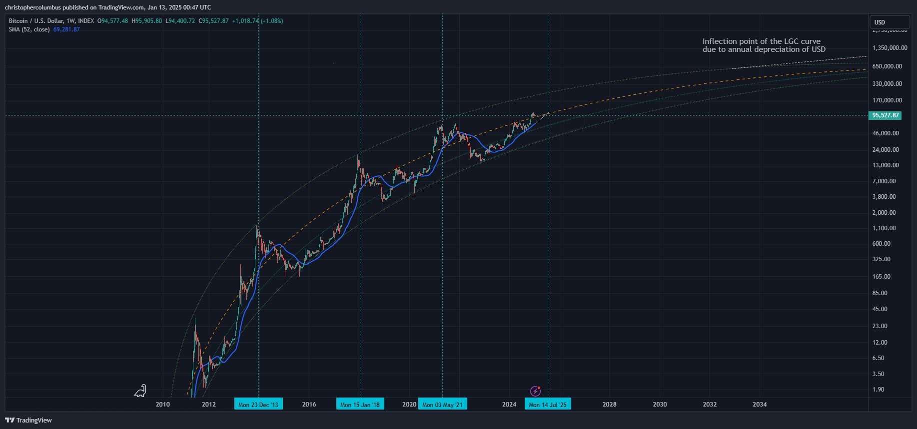 Giá Bitcoin “trước đây đã đạt đỉnh khi đường trung bình động 1 năm chạm đến điểm giữa của kênh LGC. Đề xuất đỉnh BTC giữa năm ở đây”, Dave the Wave lưu ý trong bài đăng ngày 13/1 trên X.