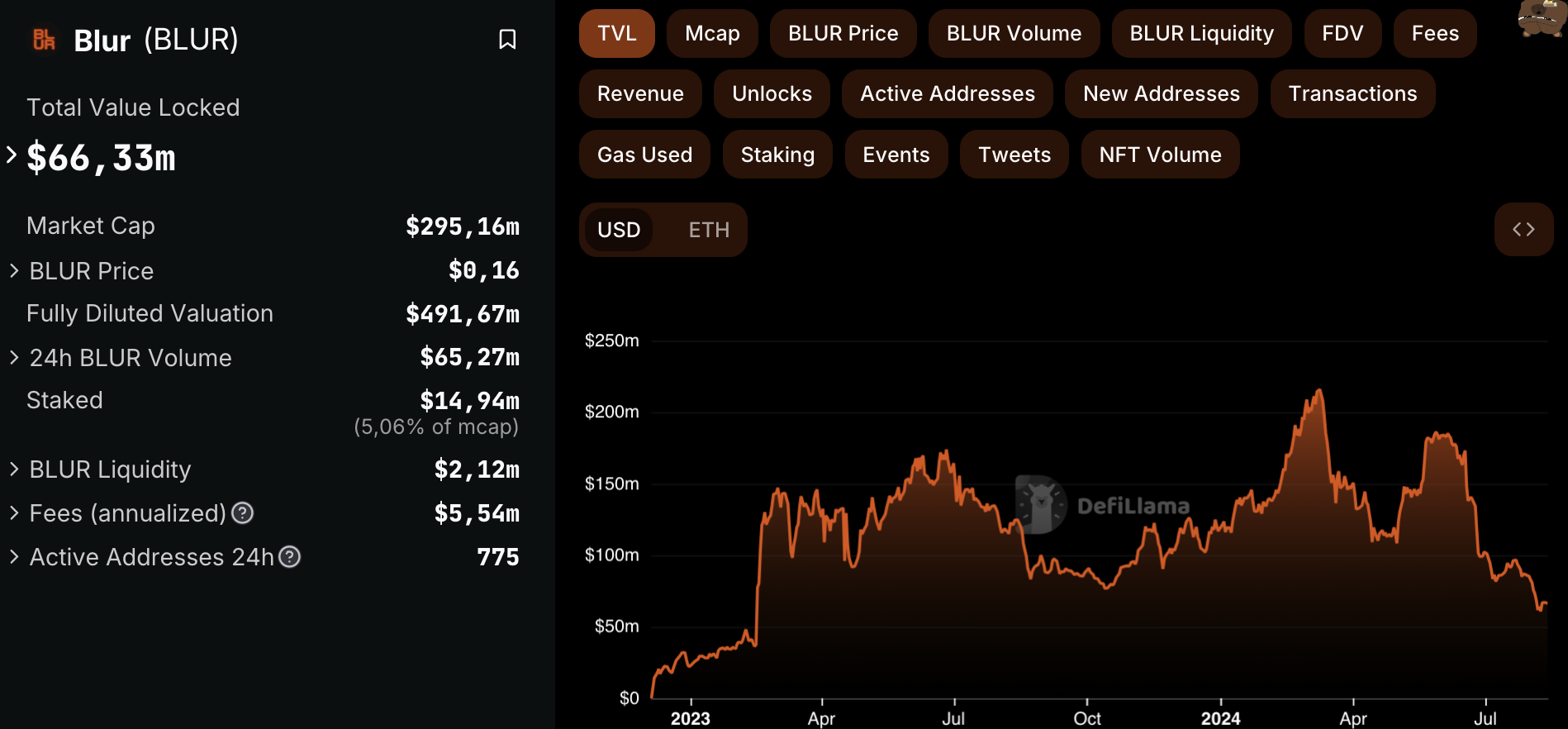 TVL của Blur hiện ở mức 66 triệu đô la. Sau đợt airdrop vào tháng 6, công ty đã phải đối mặt với những lời chỉ trích vì không hỗ trợ các dự án gốc của mình, với memecoin Pacmoon đang trong quá trình rời Blast để chuyển sang blockchain Solana.