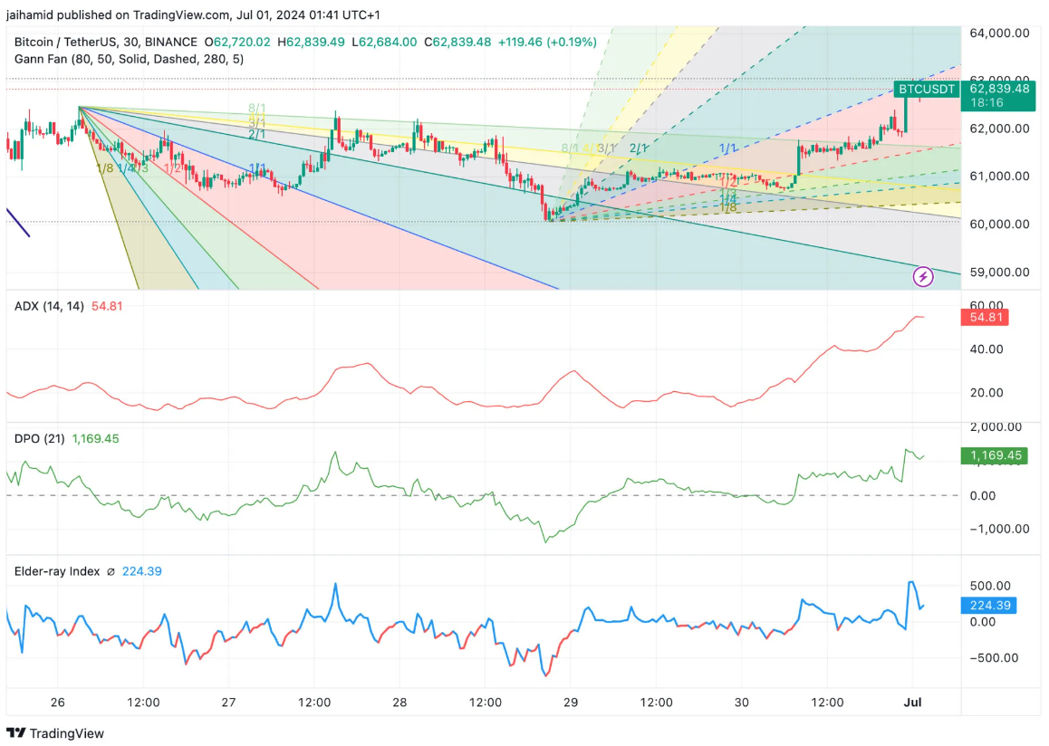 Trong khi đó, các đường Gann giao cắt và chồng chéo với hành động giá của Bitcoin, gợi ý các điểm hỗ trợ và kháng cự tiềm năng. Giá hiện đang kiểm tra một góc hướng lên (1/1), có thể đóng vai trò như kháng cự.