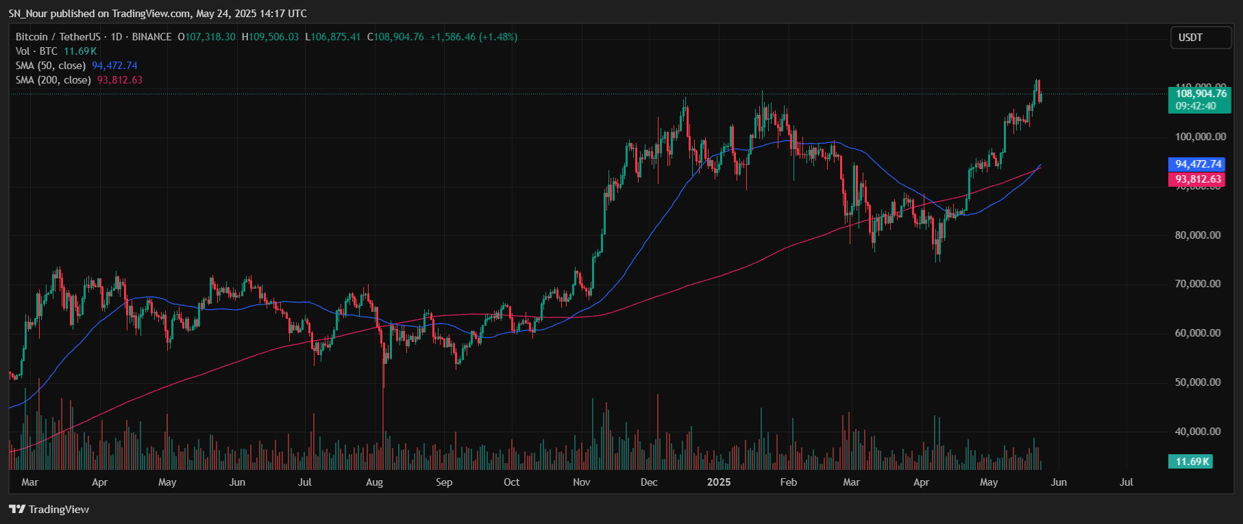 Tại thời điểm viết bài, Bitcoin đang được giao dịch ở mức $108.904, giảm hơn 1% trong 24 giờ qua. Tuy nhiên, tính trên cơ sở hàng tuần, tài sản này đã tăng hơn 5%.