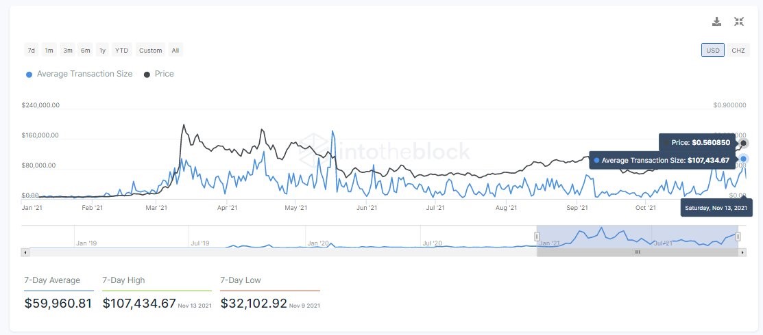 Hơn nữa, tổ chức ngày càng chấp nhận nhiều hơn khi quy mô giao dịch trung bình tăng lên và cho thấy CHZ không chỉ có sự quan tâm từ những người chơi nhỏ lẻ