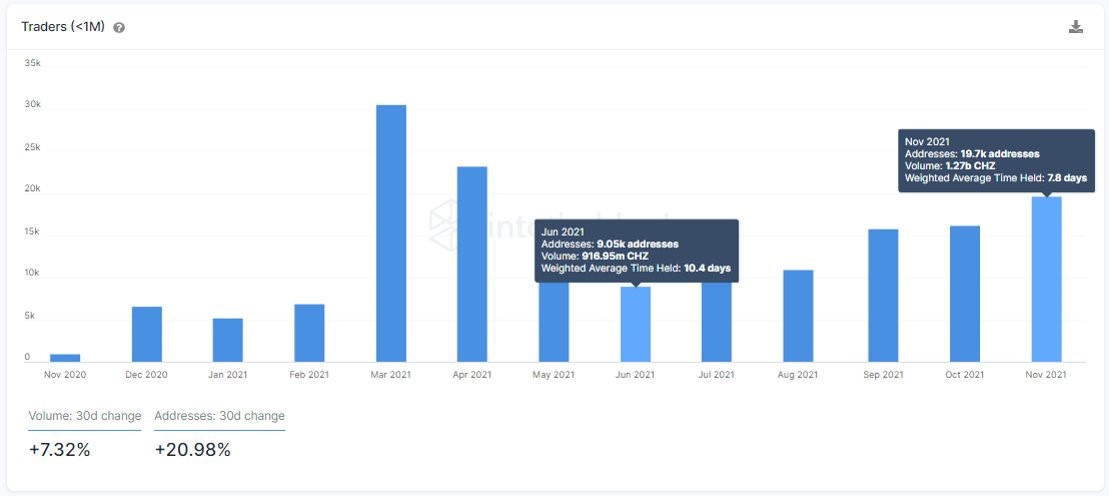 Trên thực tế, khi số lượng trader tăng lên, khối lượng cũng tăng đột biến. Tính đến ngày 14/11, số người nắm giữ CHZ đã đạt mức ATH mới là 150.500 địa chỉ, tăng gấp 7,14 lần so với đầu năm.