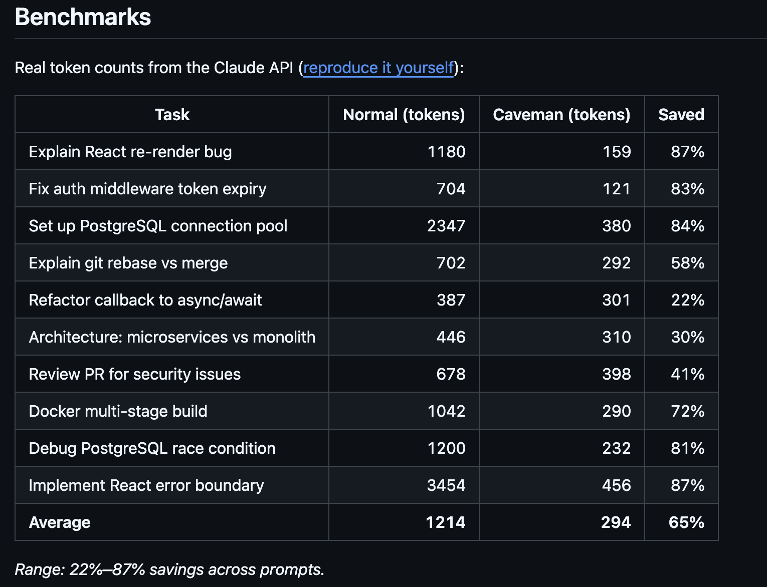 Các bài đo trong kho mã, được xác minh bằng tiktoken, cho thấy mức giảm token đầu ra đạt 68% với tác vụ tìm kiếm web, 50% với chỉnh sửa mã và 72% với các bài hỏi đáp — trung bình giảm 61% token đầu ra trên bốn tác vụ tiêu chuẩn.