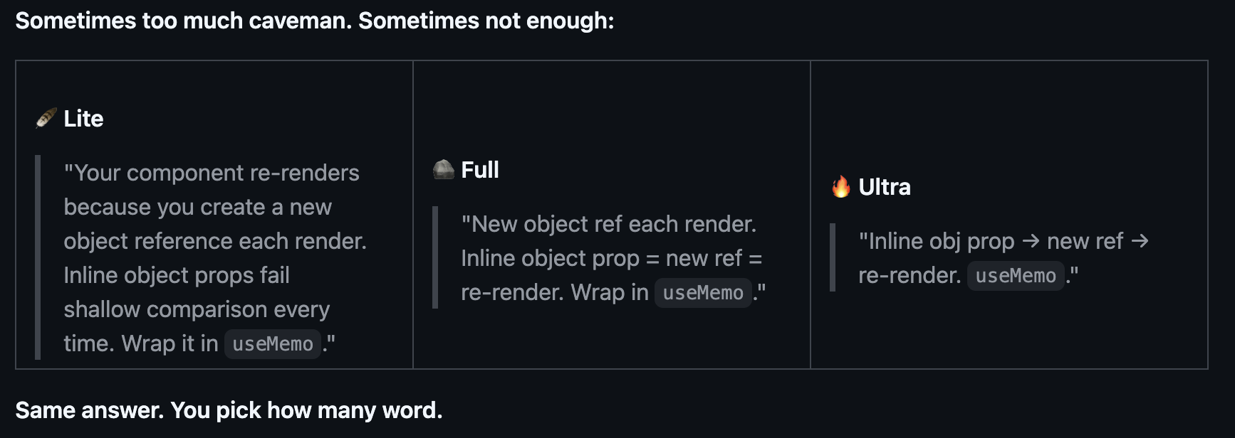 Một kho mã song song khác của nhà phát triển Julius Brussee lại chọn cách tiếp cận hơi khác, đóng gói cùng ý tưởng thành một tệp SKILL.md với 562 sao trên GitHub. Đặc tả của nó là: trả lời như một người tiền sử thông minh, lược bỏ mạo từ, câu thừa và xã giao, nhưng giữ nguyên toàn bộ nội dung kỹ thuật. Khối mã không thay đổi. Thông báo lỗi được trích dẫn chính xác. Thuật ngữ kỹ thuật vẫn giữ nguyên. Người tiền sử chỉ nói phần tiếng Anh bao quanh các факт.