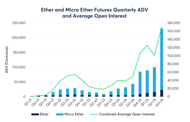 CME Group công bố trong báo cáo lợi nhuận quý 3 năm 2025 rằng giao dịch hợp đồng tương lai và quyền chọn tiền điện tử đã đạt mức cao kỷ lục mới, với tổng khối lượng giao dịch vượt 900 tỷ USD. Hợp đồng mở trung bình hàng ngày (ADOI) đạt 31,3 tỷ USD, trong khi mức đỉnh danh nghĩa được ghi nhận vào ngày 18 tháng 9 lên tới 39 tỷ USD.