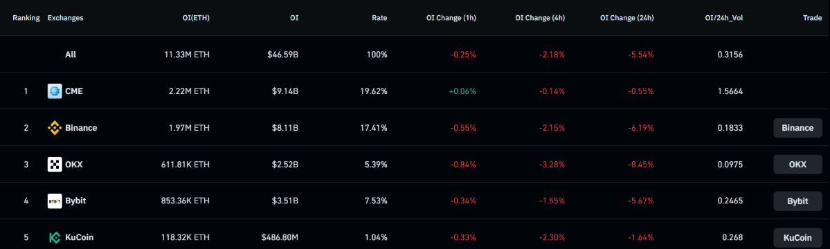 Hợp đồng mở của Ethereum giảm mạnh, CME dẫn đầu đà phục hồi