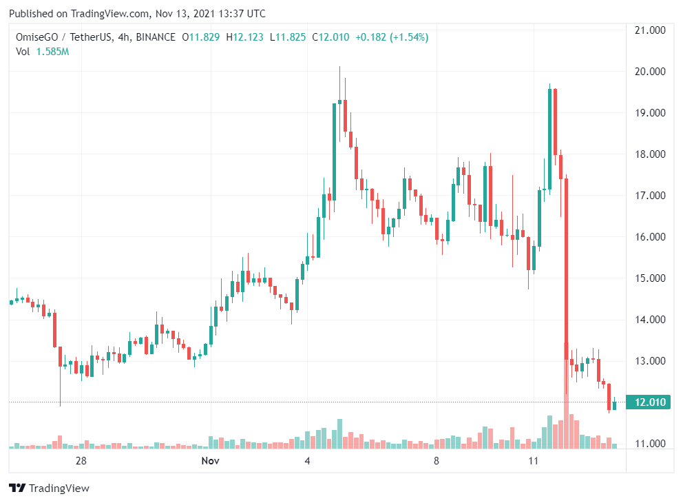 24 giờ qua khá tồi tệ đối với token của OMG Network. Tiền điện tử được xếp hạng thứ 95 giảm hơn 30% giá trị trong khoảng thời gian nói trên và giao dịch chỉ ở mức 12,01 đô la vào thời điểm viết bài.