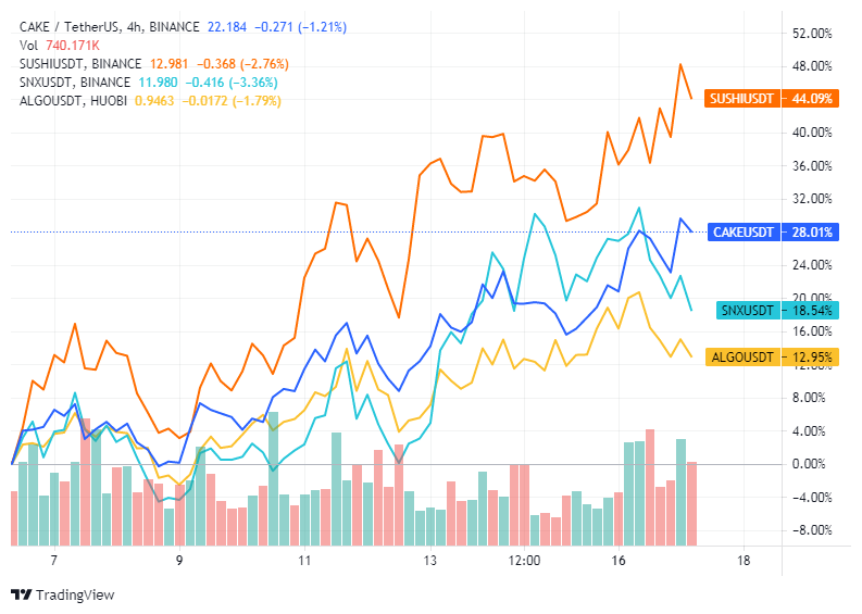 33,7%, 21,3%, 19%, 10,9% là các mức lợi nhuận hàng tuần của SUSHI, CAKE, SNX và ALGO vào thời điểm viết bài. Tất cả các token nói trên đều có điểm chung là cho phép hoạt động yield farming (canh tác lợi nhuận). Những người trong cộng đồng thường tạo thêm thu nhập bằng cách canh tác. Do đó, bất cứ khi nào HODLer khóa tiền điện tử của họ hoặc cung cấp thanh khoản, họ sẽ được thưởng. Ngoài ra, yield farmer (người canh tác lợi nhuận) thường liên tục di chuyển tiền qua nhiều giao thức khác nhau để tìm kiếm lợi nhuận cao hơn.