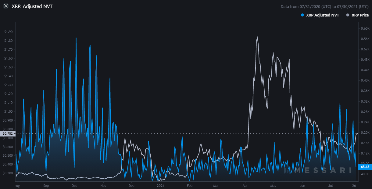 Tỷ lệ NVT đã điều chỉnh của XRP (xanh) | Nguồn: Messari
