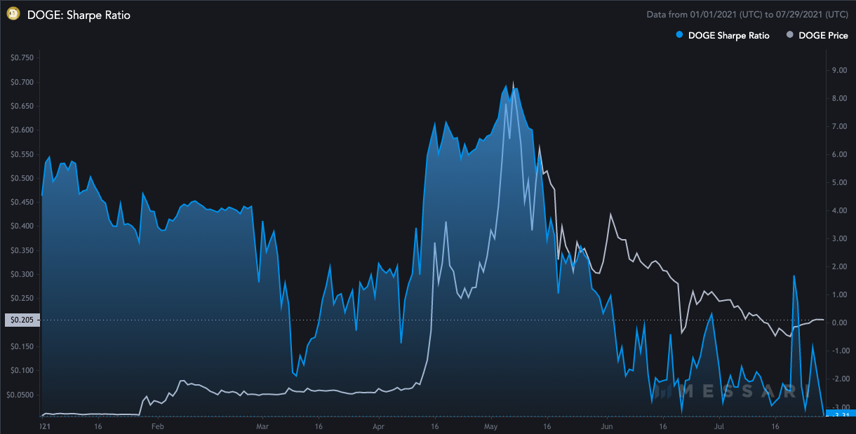 Trong phần lớn thời gian của năm 2021, tỷ lệ Sharpe của DOGE (lợi nhuận được điều chỉnh theo rủi ro) vẫn ở trên mức 0. Tuy nhiên, tại thời điểm viết bài, nó đứng ở mức âm (chính xác là -3,31). Tỷ lệ thấp hơn cho thấy HODLer phải chịu rủi ro tương đối cao hơn. Tỷ lệ lợi nhuận danh mục đầu tư âm cũng tăng lên khi tỷ lệ Sharpe giảm.