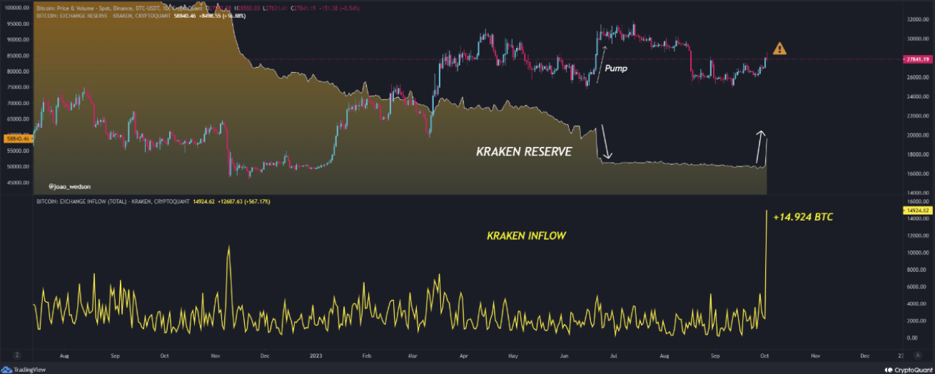 Kraken, một trong những sàn giao dịch tiền điện tử hàng đầu thế giới, gần đây đã chứng kiến sự gia tăng đáng kể về dự trữ. Việc 14.924 BTC được chuyển vào ví của sàn là một sự phát triển đáng chú ý, dẫn đến suy đoán rằng các nhà đầu tư có thể đang thực hiện các bước để đảm bảo lợi nhuận của họ hoặc thậm chí có thể định vị để dự đoán động lực thị trường trong tương lai.