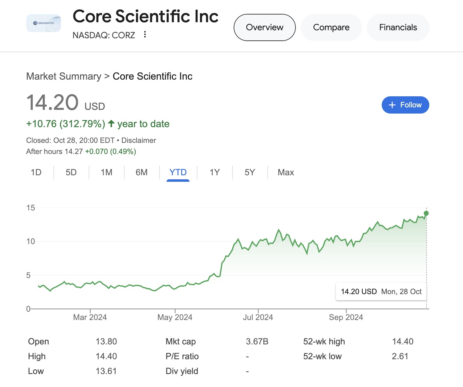 Cổ phiếu CORZ đóng cửa tăng 6,2% lên $14,20 mỗi cổ phiếu, ghi nhận mức tăng hơn 300% kể từ đầu năm.