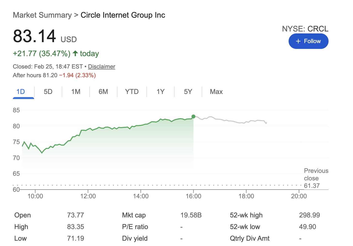 Cổ phiếu của Circle Internet Group (CRCL) tăng khoảng 35% trong phiên thứ Tư, lên 83,14 USD, nối dài đà hưng phấn từ phiên tiền thị trường sau khi công ty công bố kết quả kinh doanh quý 4 vượt kỳ vọng và đưa ra mục tiêu tăng trưởng dài hạn cho USDC.