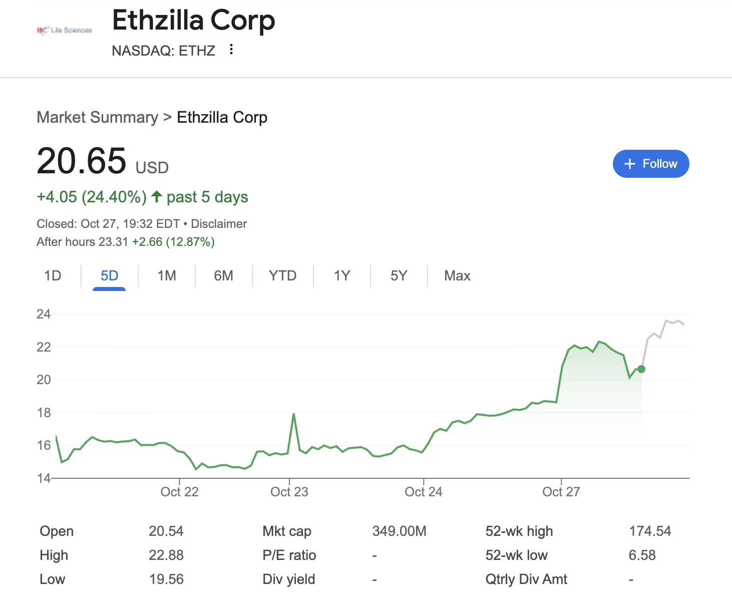 Công ty hiện còn khoảng 400 triệu USD ETH, sau khi bán bớt từ tổng số 102.916 ETH (trị giá 434 triệu USD trước giao dịch). Cổ phiếu ETHZilla đã tăng từ 12,78 USD lên 20,65 USD trong ngày và tiếp tục giao dịch quanh 23 USD sau giờ.
